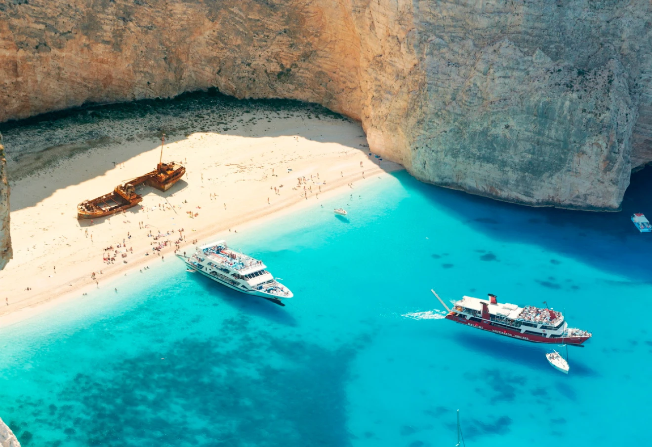 Navagio Beach, or Shipwreck Beach, is situated on Zakynthos Island and is encircled by impressive limestone cliffs. The shipwreck on the bright sand serves as the beach’s main highlight. Its unique landscape has turned Navagio Beach into one of the most photographed beaches in the world.